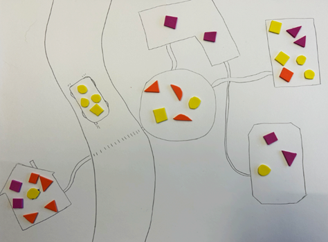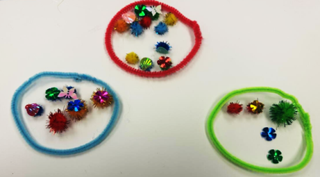In addition, students represented frequency of a variable by utilizing one of a material, such as one pom-pom or one sequenced shape, to represent one data point. This is illustrated in the examples provided in Figure 4 and the first image in Figure 5. In Figure 7, each pom-pom was a data point, with different colored pom poms representing a different movie genre.