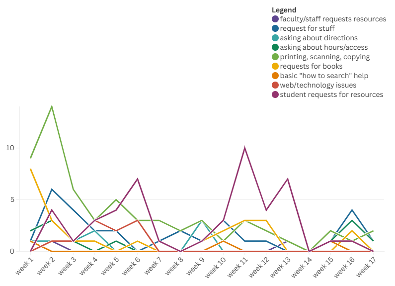 Letâs explore the trends of the quilt thus far. We answer a lot of questions as reference librarians, but reference transactions ebb and flow over the course of a semester. Week 2 was my busiest week for questionsâfirst-year students found their way to the library and had questions about how it worked. Most of the questions I got that week were about printing (14 of 33 queries), which makes senseâitâs not intuitive how to print at our library.Â