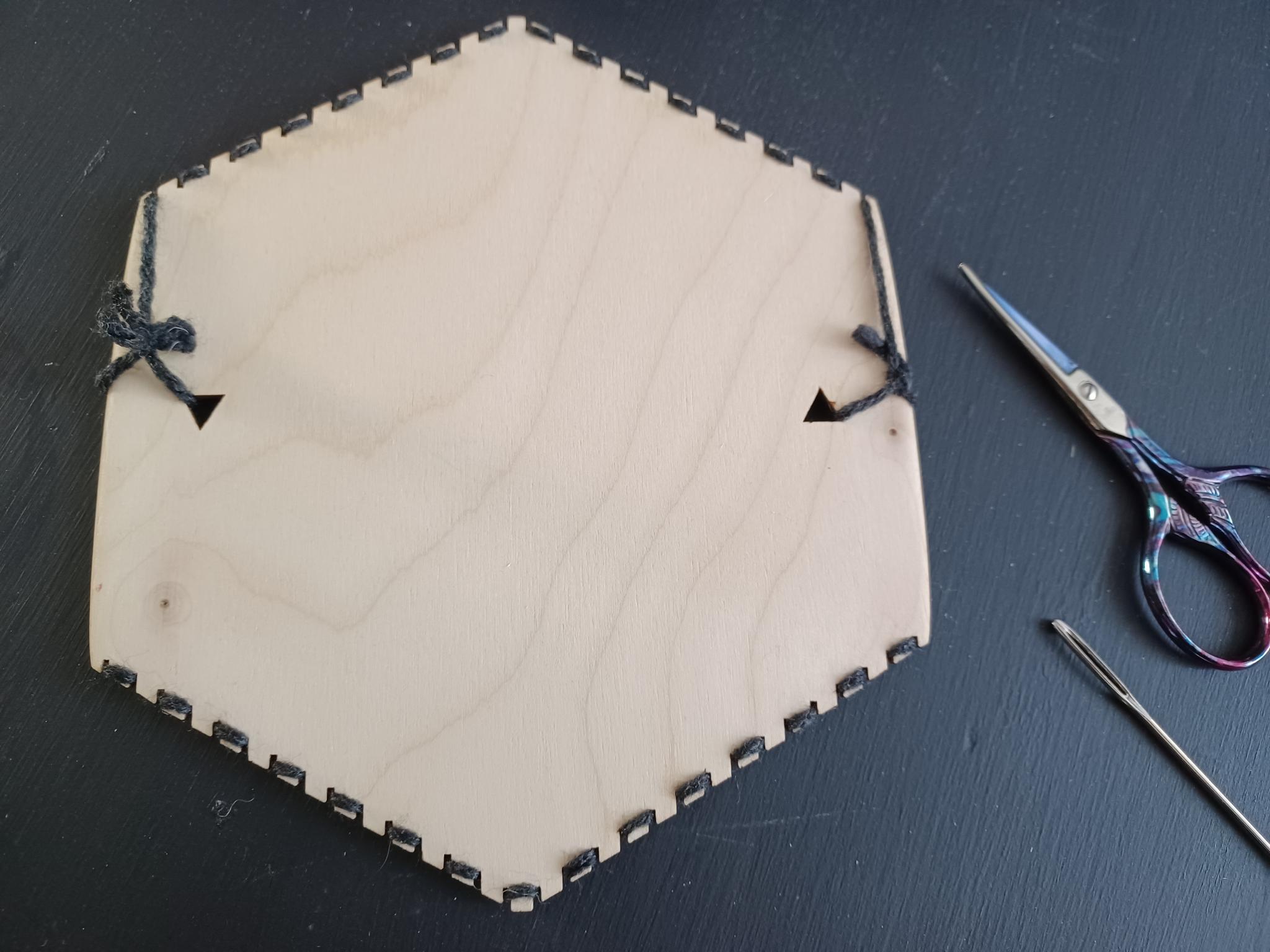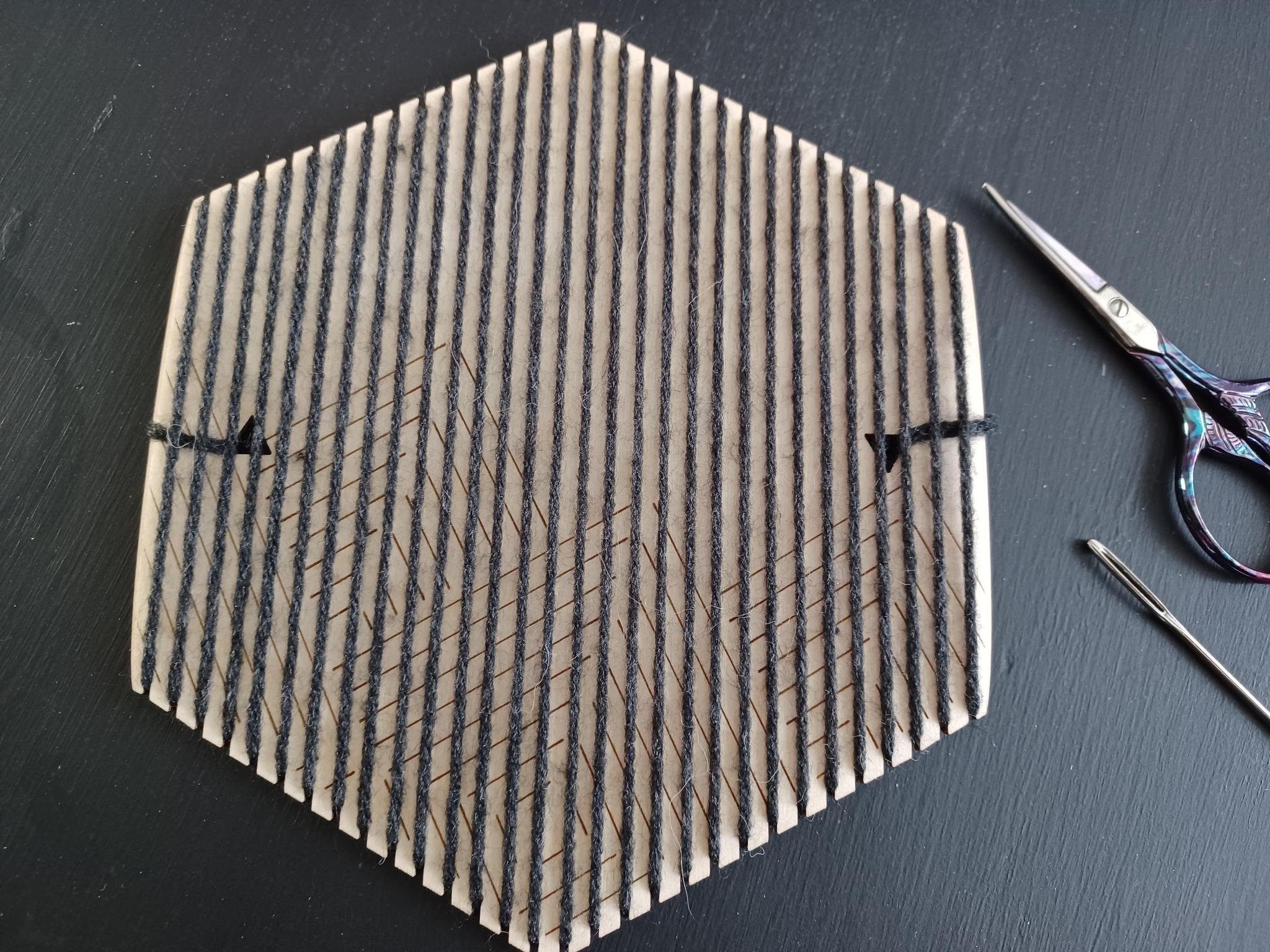 - Thread the yarn into the darning needle and begin your weave. For the hexiloom, start with the bottom five warp strands, as shown in Figure 6. Weave by moving your needle below a warp strand, then above the next one, then below the next one, and so on. Leave yourself a long enough tail to sew in at the end. (Again, I recommend leaving a longer tail than shown in Figure X, as mine was too short to easily sew in at the end.)
