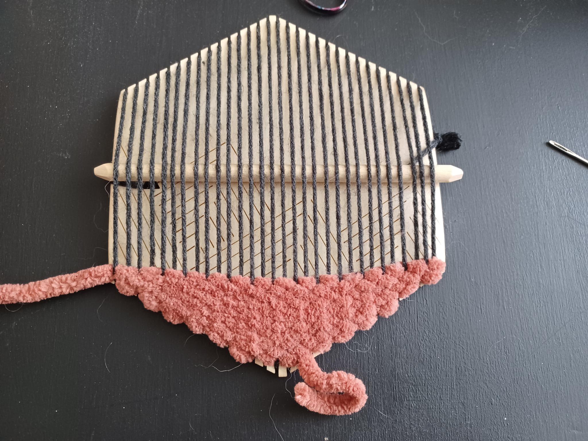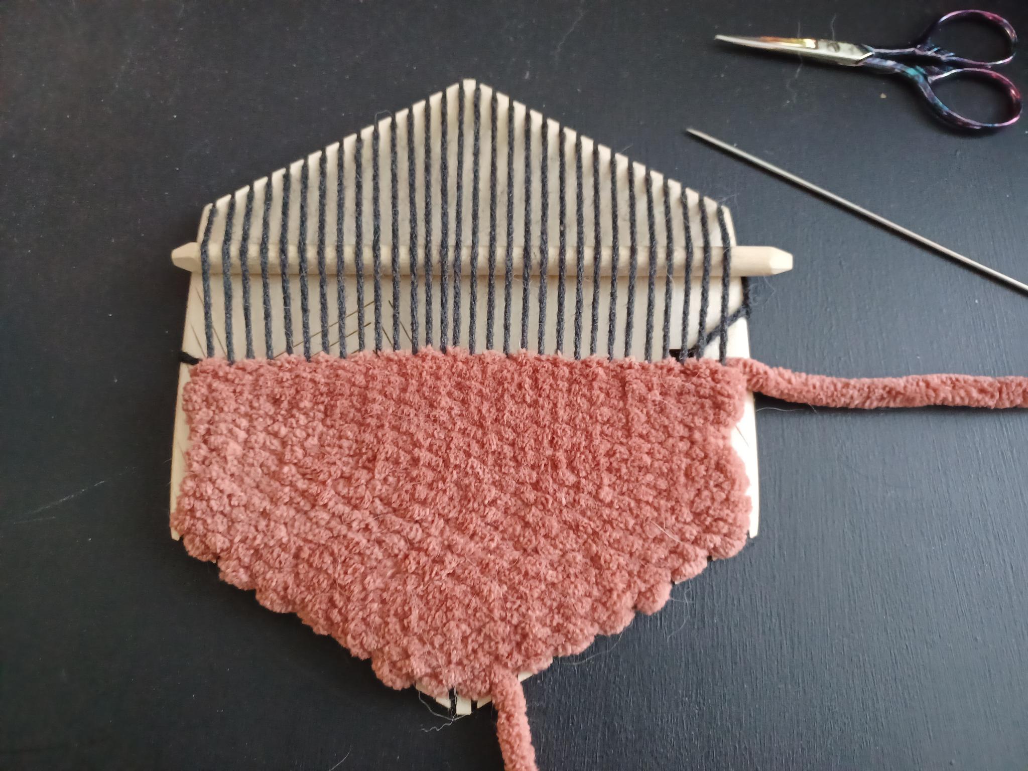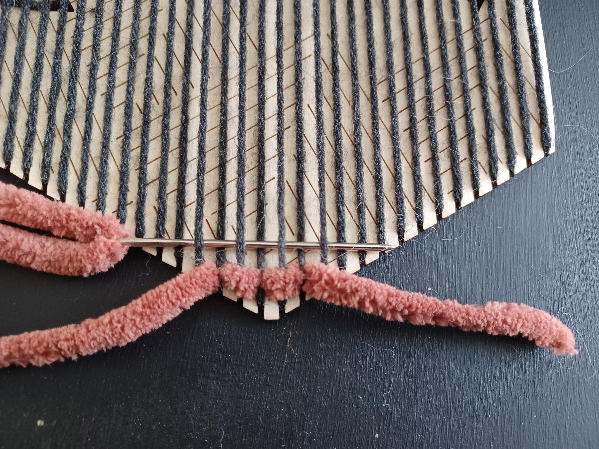 - Work your third layer back to the outside of the loom as normal. Then follow the pattern of weaving above and below as normal up the remaining section of the loom. Approximately every second or third layer towards the centre of the loom should stitch into the 6-weight yarn to keep it connected. If you do not stitch into the 6-weight yarn like this, the result will be disconnected and not as strong. Figure X shows approximately half of the 4-weight section completed with stitching into the 6-weight section.