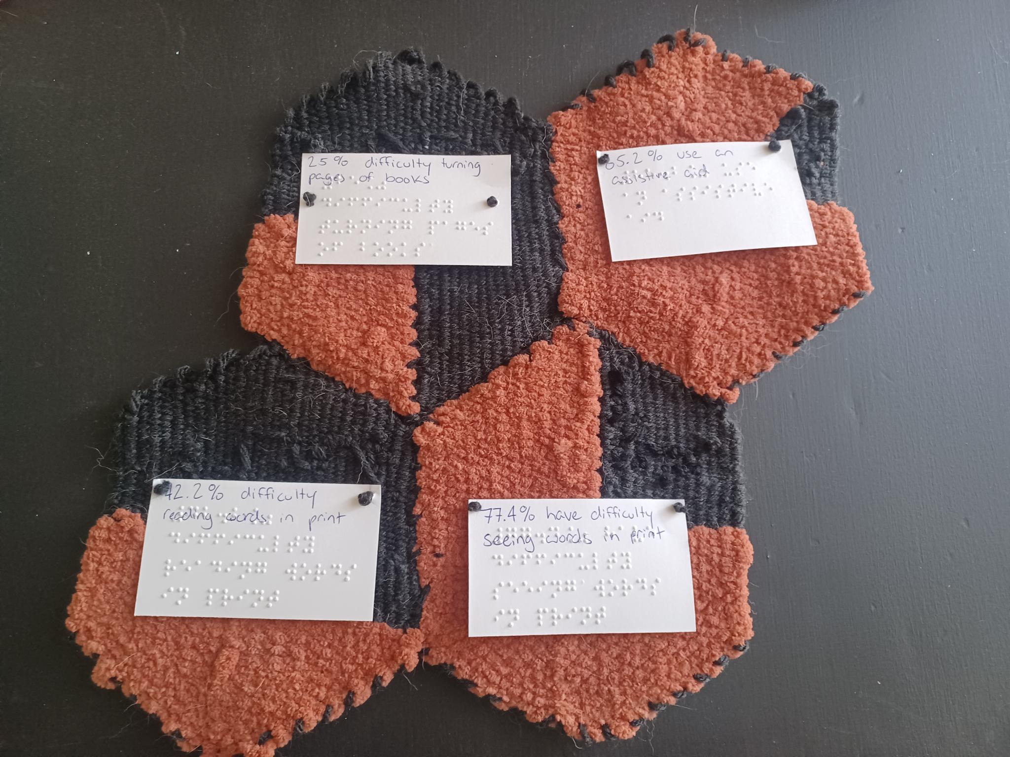 The goal of this woven tactile pie chart project is to make data accessible to sighted and visually impaired audiences. By using a combination of yarn colour and weight, the pie charts are completely legible by sight and by touch. Adding braille data labels makes the data even more accessible to people with visual impairments. For the samples used in the pattern tutorial below, I used data from the 2023 Statistics Canada report on Print Material Accessibility. According to this report, 5.2 million people in Canada report difficulty reading print materials. The weave that illustrates the tutorial below uses the statistic from this report that 77% of those 5.2 million people have difficulty seeing words in print. I used additional data from this report for more woven pieces, which I then sewed together to make a larger tapestry of data.