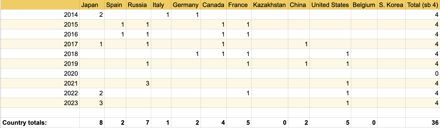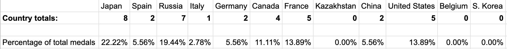 I used a Google spreadsheet to gather my data from a fan-run website, SkatingScores.com. SkatingScores offers a queryable database, but also tidy overview pages for competitions.6 My spreadsheet had 3 sheets for gold, silver and bronze medal data. I placed the years on the vertical axis and countries on the horizontal axis and began counting medals by country.Â