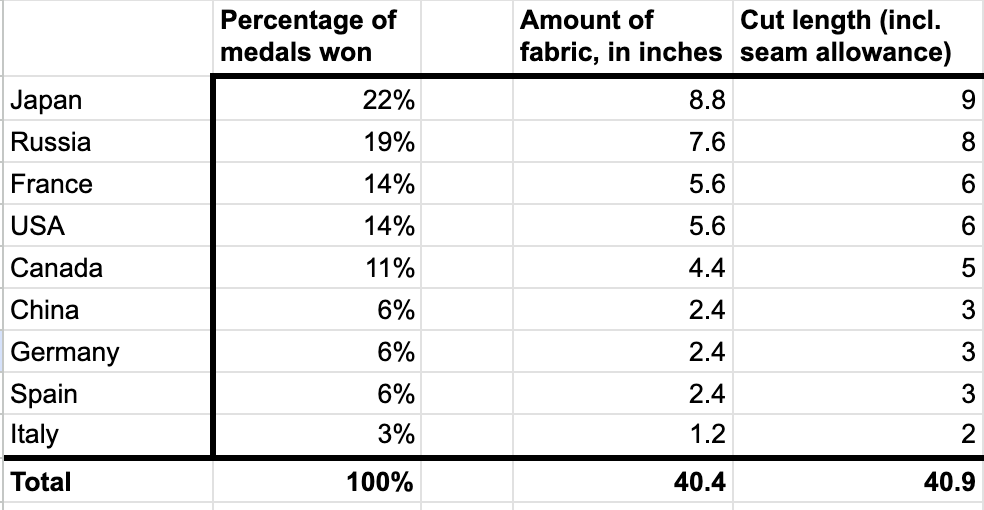 I used a standard quarter inch (0.25â) seam allowance, so the cut pieces will all have a standard width of 10.5â (allowing 0.25â on each edge). To figure out the lengths to cut, I returned to my spreadsheet and the column of percentage of medals won by country in descending order. Using spreadsheet functions, I multiplied the percentages by 40 (our desired final length). I then added 0.5â to each value in a new column for the seam allowances, and rounded to whole numbers for ease of cutting.